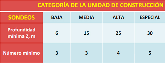 Con el fin de definir el suelo de fundación, se proponen las perforaciones referidas en la tabla 2, de acuerdo a la categoría de la unidad de construcción del proyecto de la tabla 1, en la que se determinara la capacidad portante del suelo.